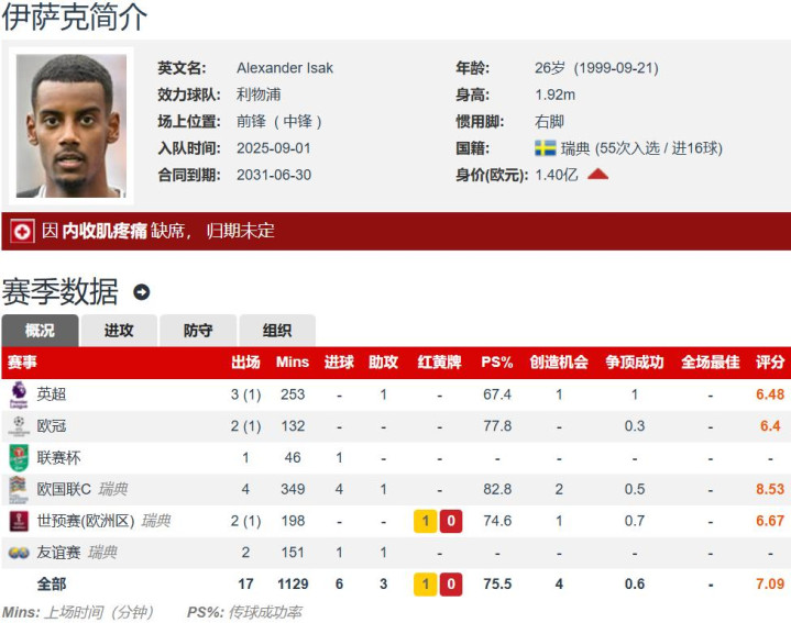 伊萨克现年26岁,上赛季的英超银靴,已经在英超证明过自己,德转估价1.4亿欧元,今年夏窗以1.45亿欧元的转会费从纽卡斯尔加盟利物浦。由于利物浦今年夏窗已经高价签下中锋埃基蒂克,加上伊萨克缺席季前赛和前3轮英超的比赛,以及伤病原因,伊萨克仅为利物浦在英超出场4次,其中3次首发,没有进球,送出1次助攻;欧冠出场3次,其中2次首发,0球0助。伊萨克目前又在养伤,据悉内收肌存在长期伤病隐患。