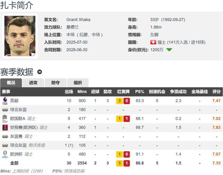 扎卡现年33岁,德转估价1200万欧元,今年夏窗以1500万欧元的转会费从德甲勒沃库森加盟英超升班马桑德兰,立马成为球队主力以及队长,在中场坐镇,出战了本赛季至今全部的10场英超的比赛,并且全部首发,打入了1球,送出了3次助攻,是桑德兰目前排名英超第四的重大功臣。桑德兰仅花费1500万欧元就签下非常自律又能战的英超经验中场,调度有方,能攻善守,是黑猫军团名副其实的“大脑”。