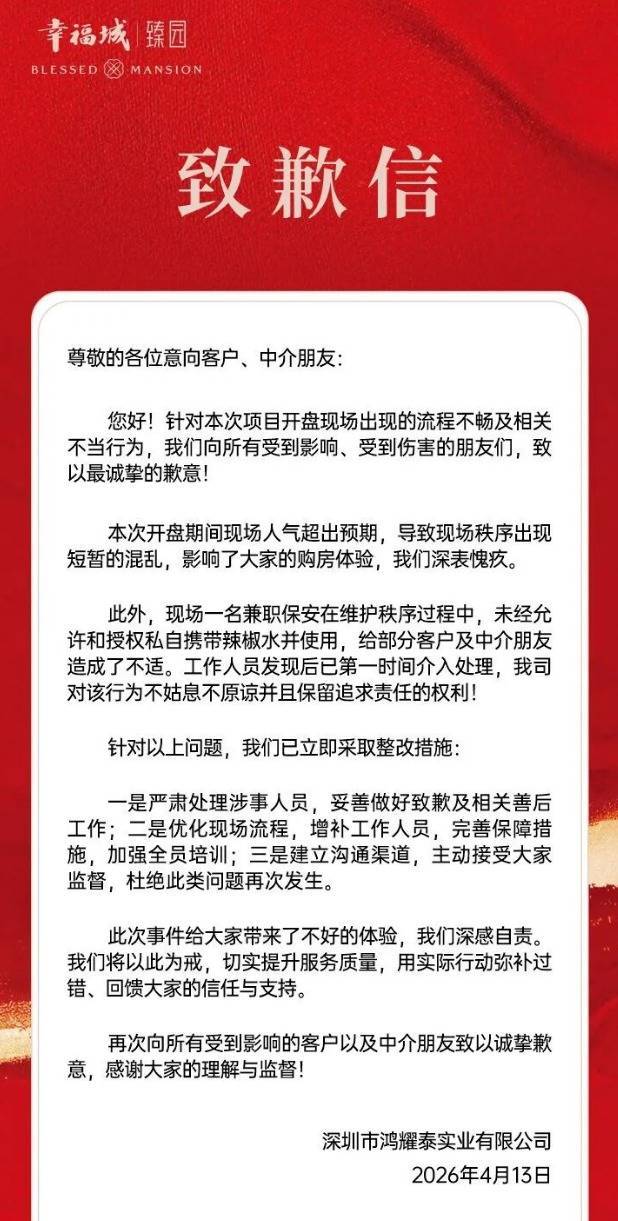 针对喷洒辣椒水和现场混乱的情况,4月13日中午,开发商紧急发布《致歉信》。