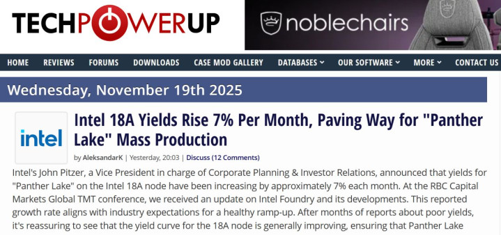 【环球网科技综合报道】11月20日消息十大配资排行,据TechPowerUp报道,英特尔副总裁约翰·皮策(John Pitzer)近日对外披露,基于18A制程工艺的“Panther Lake”处理器良率正以每月7%的速度持续提升。这一增长节奏与行业健康爬坡预期保持一致,有效回应了此前关于该工艺“良率低迷”的相关传闻。