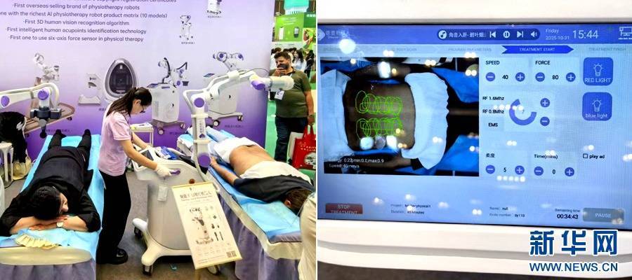 2025年10月31日,138届广交会上,采购商体验AI理疗机器人和AI机器人筋膜仪。新华网 卢鉴 摄海外社交平台拥有52万粉丝的巴西科技博主塞米(Cymye)自2009年起参加广交会。她表示,中国高科技、新技术的发展让她印象深刻,中国智能健康系统的创新产品成为她社交平台账号粉丝增长的“流量密码”。她认为,138届广交会上展出的能在斜度40度的楼梯、坡道上平稳移动的电动轮椅科技含量和性价比很高。